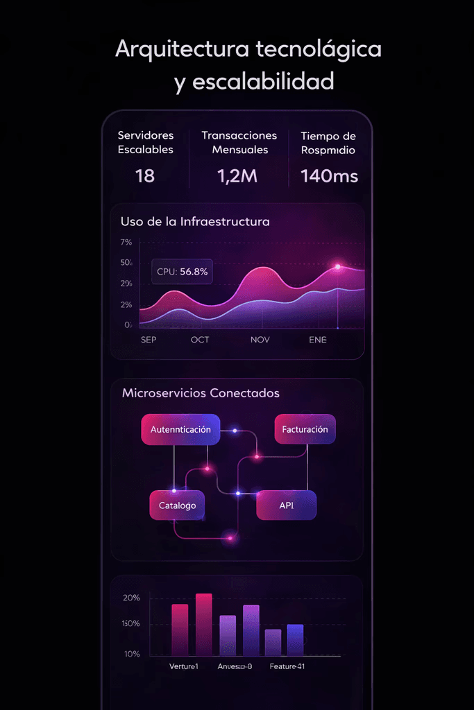 Diseñamos arquitecturas tecnológicas sólidas que permiten escalar sistemas, integrar nuevas soluciones y asegurar estabilidad a largo plazo.
