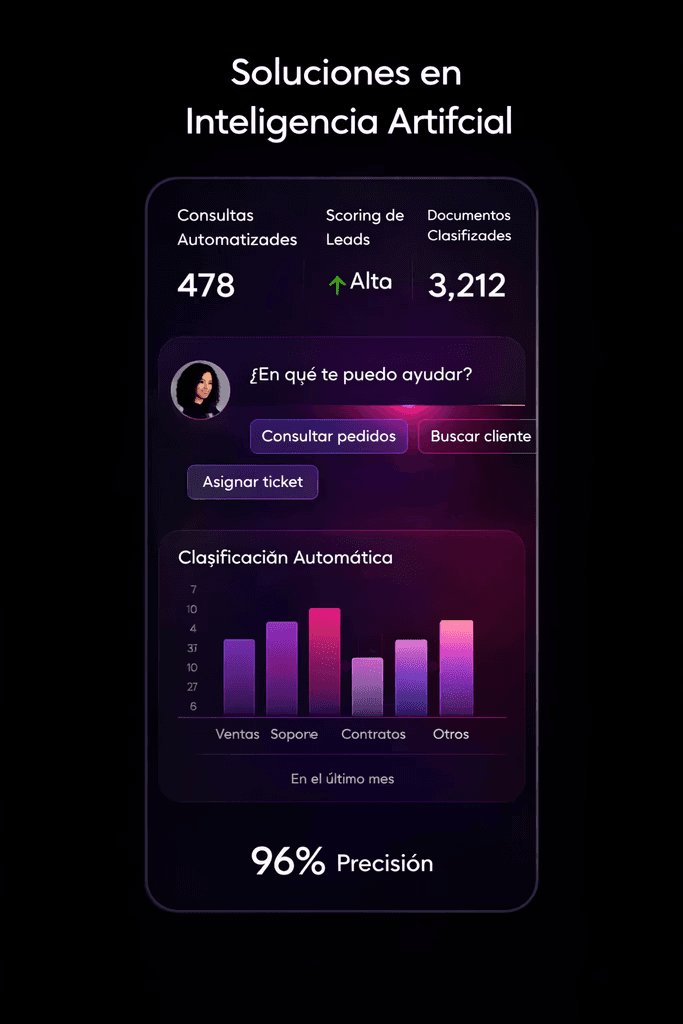 Implementamos soluciones basadas en inteligencia artificial para automatizar tareas, optimizar procesos y apoyar decisiones mediante modelos entrenados con datos reales.
