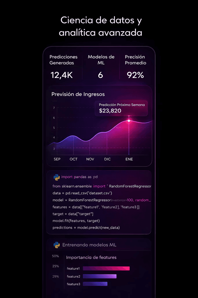 Desarrollamos sistemas como CRMs empresariales, plataformas internas, herramientas de automatización, soluciones con inteligencia artificial y análisis avanzado de datos, siempre adaptados a las necesidades reales de cada negocio.
